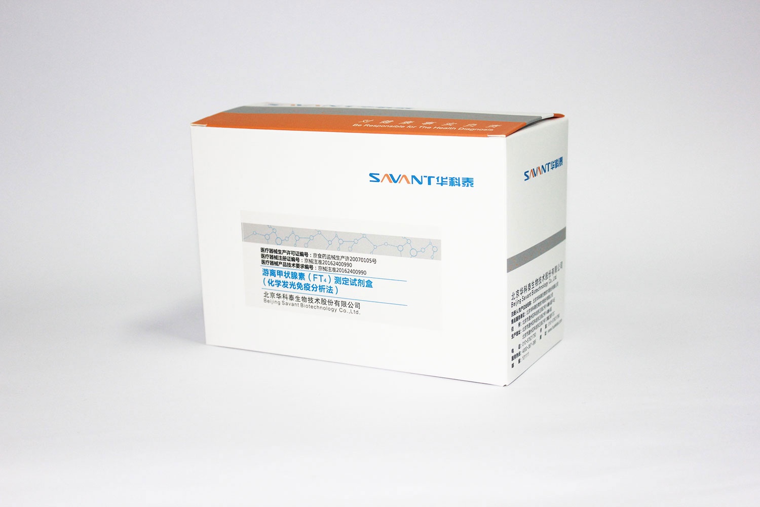 This kit is used for quantitative determination of free thyroxine (FT4) in human serum in vitro. Free thyroxine (FT4) is the free thyroxine (T4) in serum. T4 is a small hormone with molecular weight of 777 synthesized by thyroid gland. Under the action of TSH, T4 is released from the thyroid gland and enters the blood. Most of T4 in the blood combines with TBG, and only about 0.5% of FT4 acts on the target cells. It is very important to measure the level of serum FT4 in the diagnosis and treatment of thyroid function and related diseases.