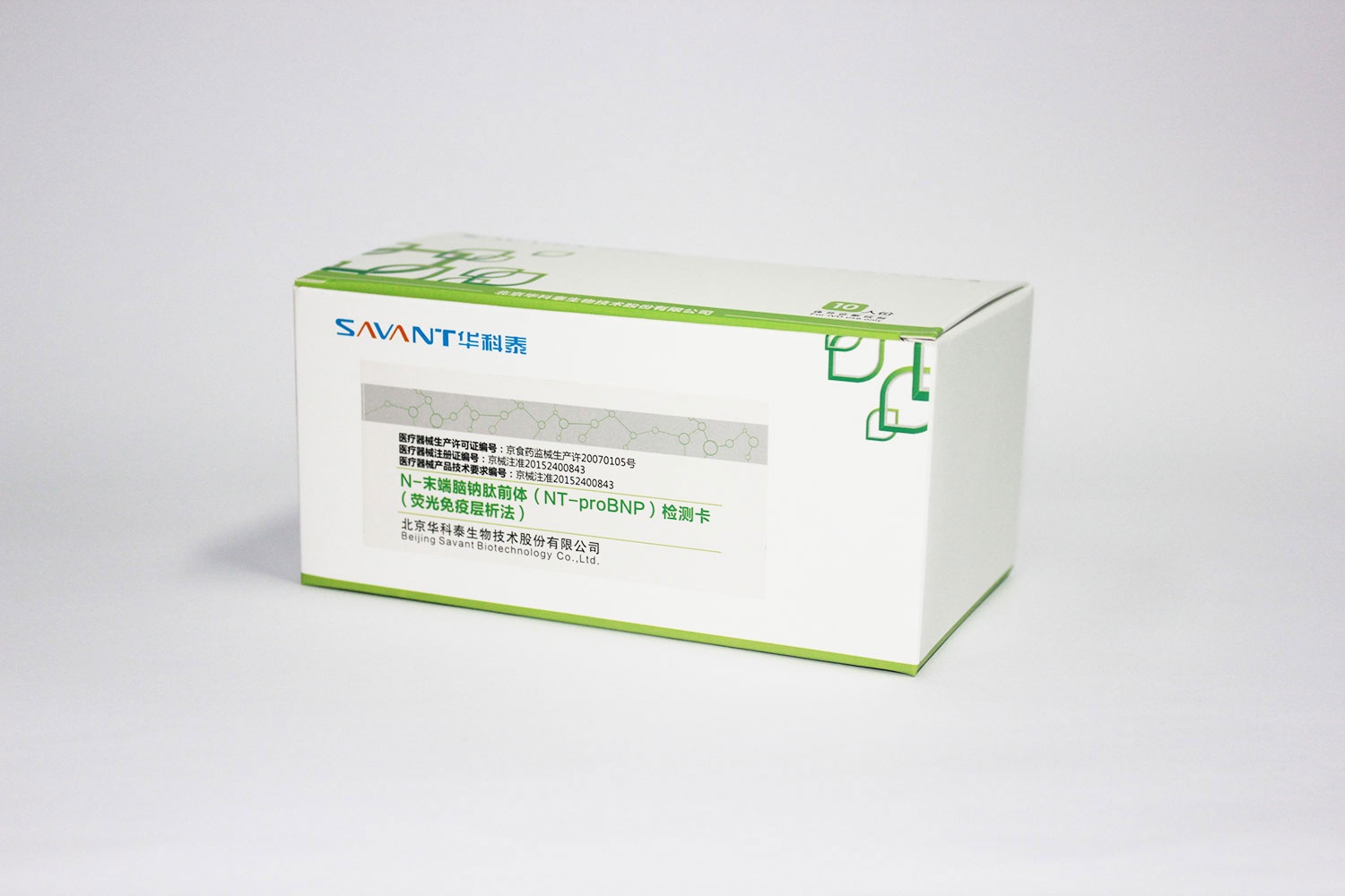 This test card is used for quantitative determination of N-terminal pro brain natriuretic peptide in human serum, plasma or whole blood in vitro. The N-terminal pro brain natriuretic peptide (NT proBNP) is an inactive N-terminal fragment after the division of proBNP, which is secreted by the left ventricle when the cardiac myocytes are subjected to capacity load and pressure load. The determination of NT proBNP in human serum and plasma can be used as an auxiliary means to diagnose and monitor mild cardiac dysfunction in patients with suspected congestive heart failure, to assess the severity of patients with congestive heart failure and the risk level of patients with acute coronary syndrome and congestive heart failure, and also to monitor the treatment of patients with left ventricular dysfunction.